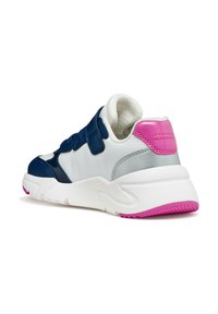 Baskets blanches et bleu marine avec accents roses, dotées d'une bride en velcro, de détails pailletés et d'une semelle en caoutchouc texturée. Conception respirante.