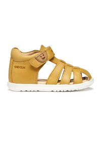 Sandale en cuir bleu marine avec multiples découpes, bride réglable et semelle en caoutchouc blanche. Dispose d'un patch de marque sur le côté.