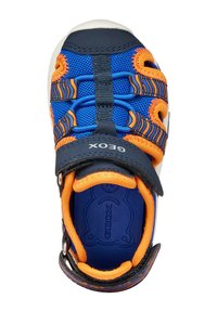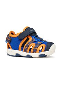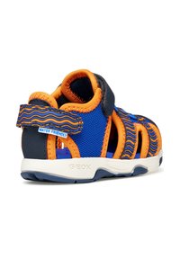 Sandale fermée pour enfants de couleur bleue et orange avec des côtés en mesh, une bride réglable à Velcro et une semelle en caoutchouc blanche.