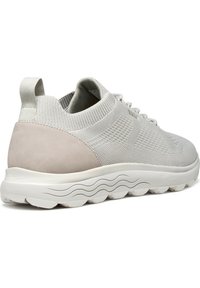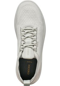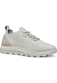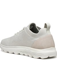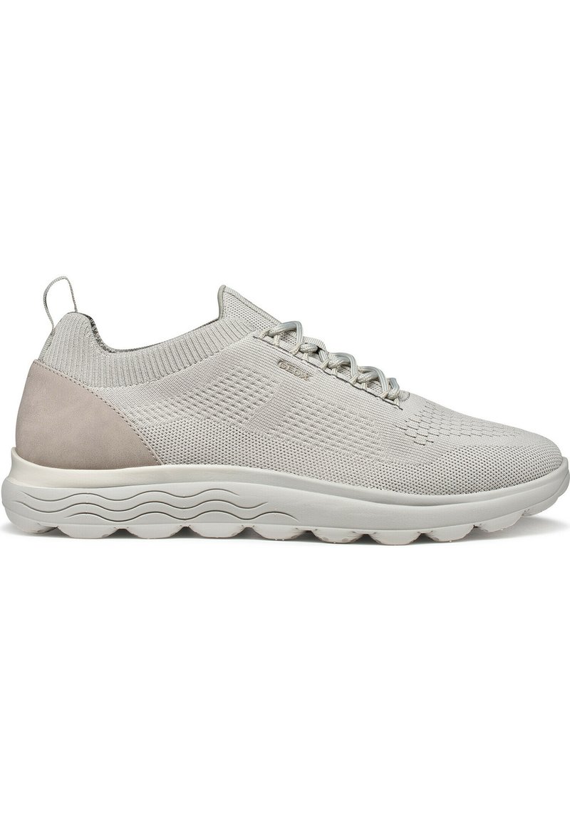 Baskets en tissu tricoté gris clair avec talon en daim beige, semelle ondulée blanche, languette de traction et fermeture à lacets.