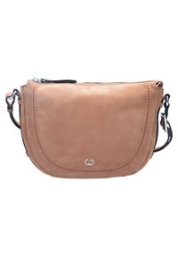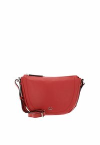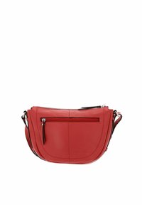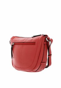 Sac bandoulière en cuir rouge avec surface texturée, sangle réglable, fermeture éclair argentée et petit logo argenté au centre avant.