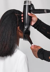 Étape quatre : Commencez par les sections inférieures. À l'aide d'une brosse ronde en céramique ghd, séchez chaque section en augmentant progressivement la température et le flux d'air pour des résultats lisses et brillants.