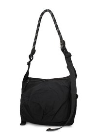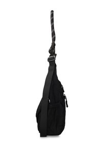 Sac à épaule en tissu noir avec poche zippée à l'avant, bandoulière noire réglable et poignée tressée noir et blanc, affichant un logo GMV subtil.