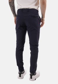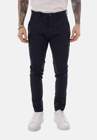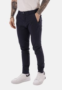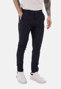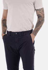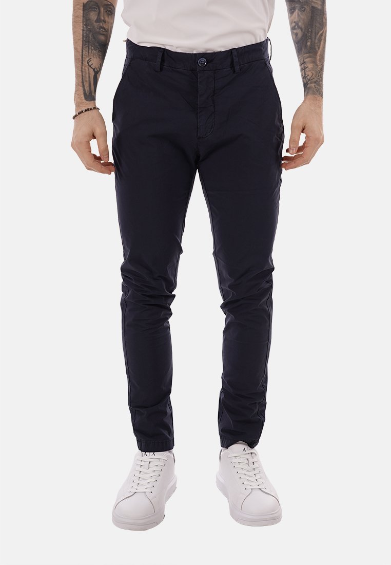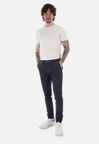 Homme portant un pantalon slim bleu marine, des baskets blanches et une chemise blanche, avec des bras tatoués et un bracelet de perles visible.