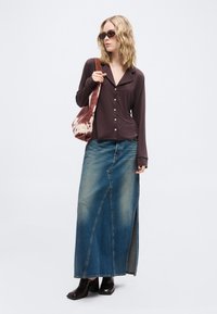 Jeune femme aux cheveux blonds mi-longs portant une chemise boutonnée marron foncé à manches longues et une jupe en denim bleu.