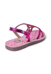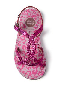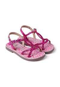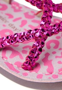 Pantalon recouvert de sequins roses associé à des sandales à brides tressées rose vif sur un fond clair.