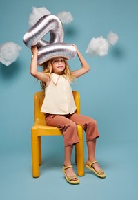 Fille assise sur une chaise jaune tenant un grand ballon argenté en forme du chiffre quatre sur un fond bleu avec des nuages en coton.