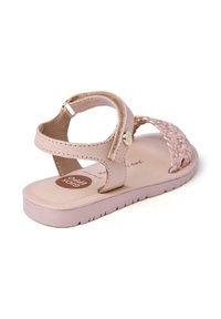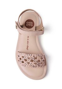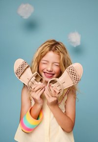 Un enfant aux cheveux blonds tient une paire de sandales beige à brides décoratives, tirant la langue de manière espiègle sur un fond bleu.