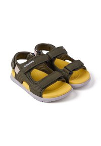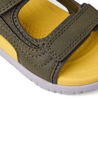 Sandale ouverte pour enfant avec des brides vert olive, une semelle intérieure jaune, des fermetures Velcro ajustables, et une semelle blanche, vue de côté sur fond blanc.