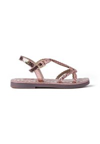 Sandales argentées à imprimé serpent avec brides tressées et fermeture à boucle. Semelle plate avec une semelle intérieure texturée. Couleur neutre.