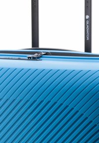 Valise rigide bleue avec des lignes texturées diagonales, poignée noire rétractable, quatre roues et logo de la marque au centre du panneau avant.