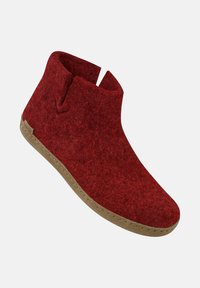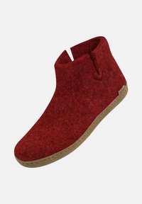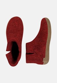 Bottine en feutre rouge avec une semelle beige douce et une petite encoche latérale en haut pour un enfilage facile.