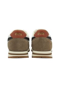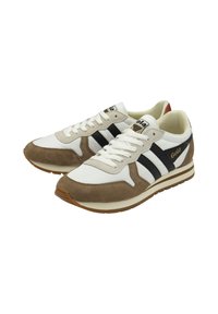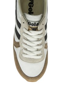 Baskets blanches avec des rayures noires et des accents en daim marron, caractérisées par un bout arrondi, une semelle en caoutchouc et des détails en tissu texturé. Logo Gola affiché.