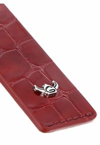 Porte-clés rectangulaire rouge avec texture crocodile et petit emblème tête de taureau en argent fixé à un anneau métallique rond.