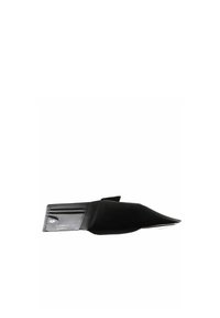 Portefeuille noir en cuir à deux volets avec couture précise et petit emblème argenté en bas à droite sur fond blanc.