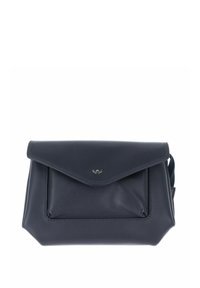 Pochette en cuir noir avec fermeture à rabat et petit emblème argenté centré sur le rabat, présentée sur fond blanc.