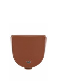 Petit sac bandoulière en cuir noir avec rabat incurvé et petit logo argenté centré en bas.
