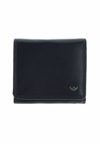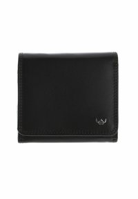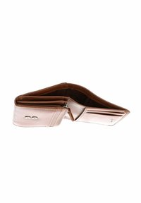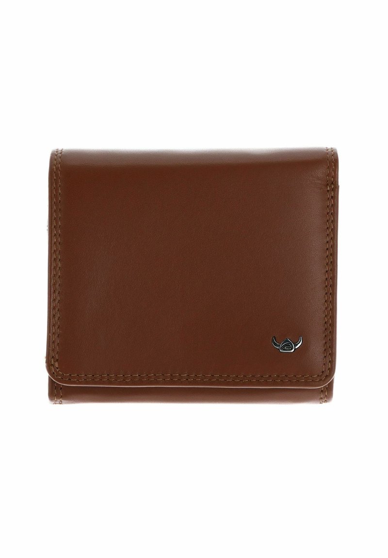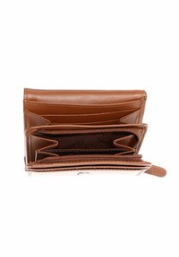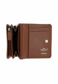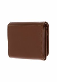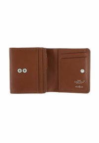 Portefeuille en cuir marron avec des coutures visibles et un petit emblème argenté en bas à droite.