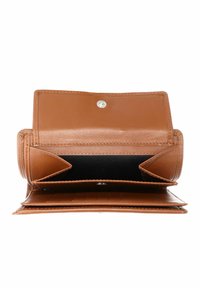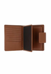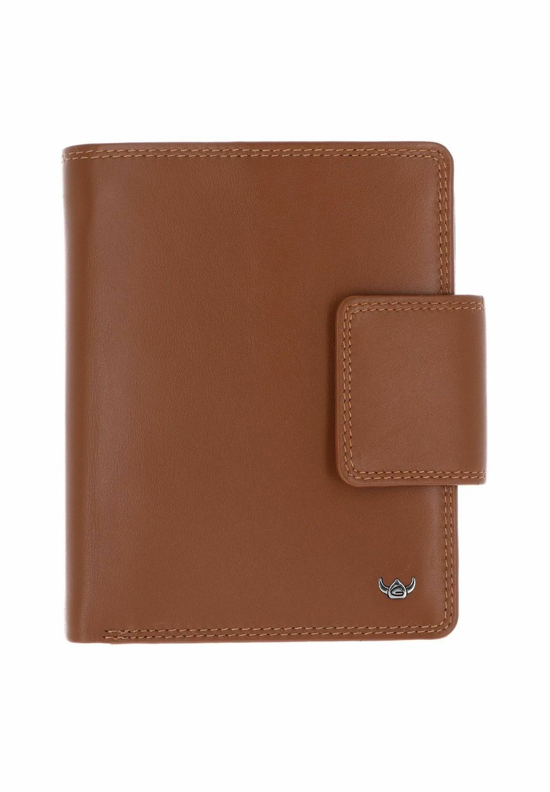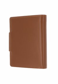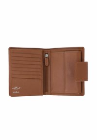 Portefeuille en cuir marron avec fermeture à pression et petit emblème argenté en bas à droite, mettant en valeur de fines coutures le long des bords.