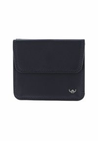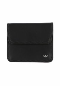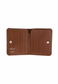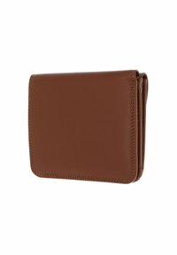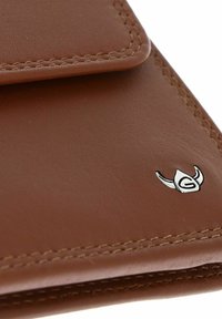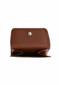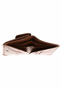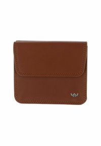 Portefeuille en cuir marron avec fermeture à rabat et un petit emblème argenté dans le coin inférieur droit, présenté sur fond blanc.
