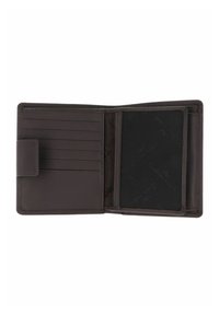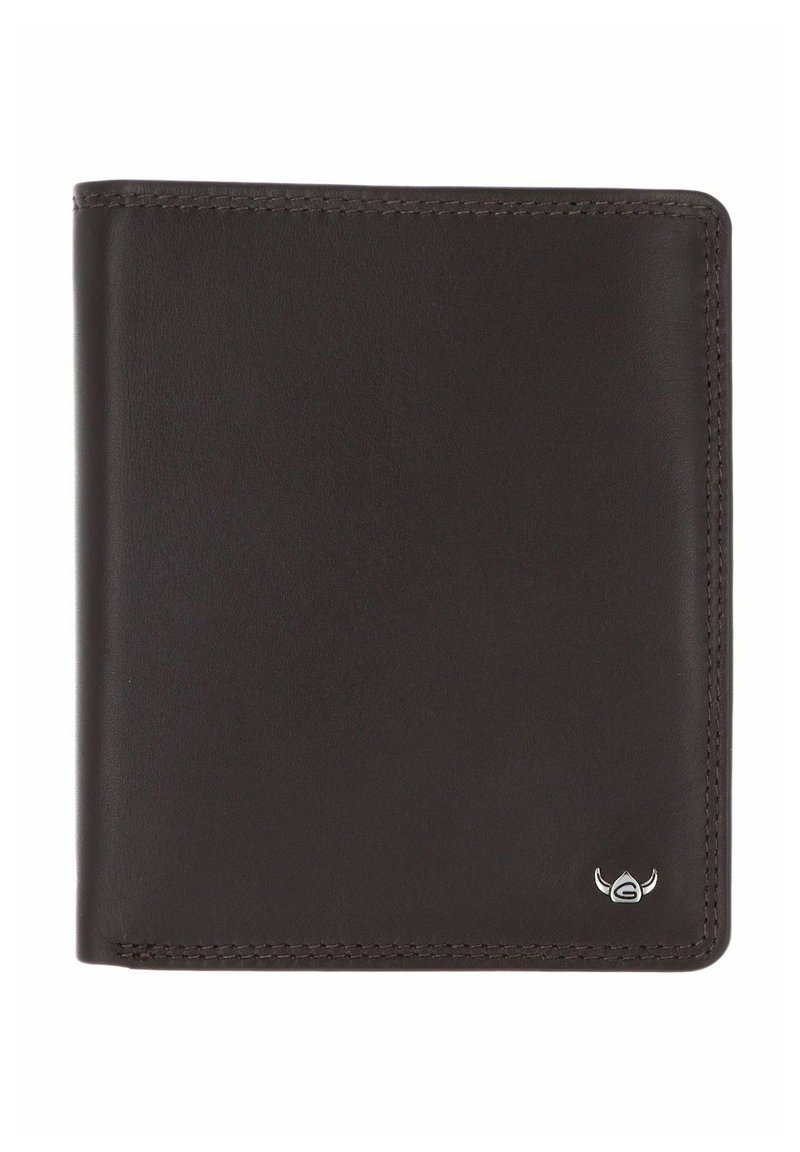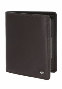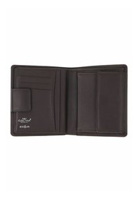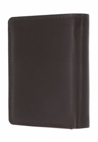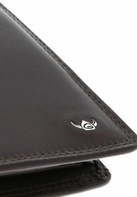 Portefeuille bifold en cuir marron foncé avec des coutures apparentes et un petit emblème argenté dans le coin inférieur droit.