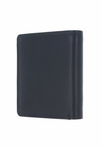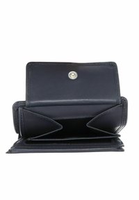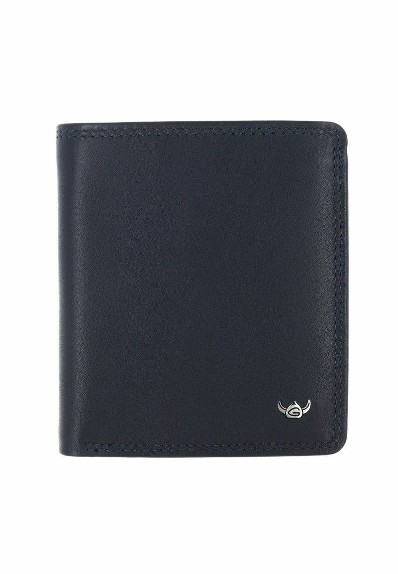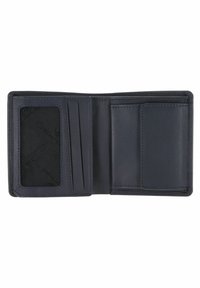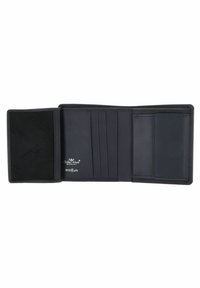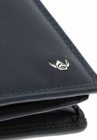 Portefeuille noir en cuir bifold avec des coutures soignées et un petit logo argenté avec des cornes dans le coin inférieur droit.