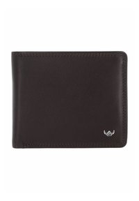 Portefeuille en cuir noir bifold avec couture visible et petit logo argenté dans le coin inférieur droit.