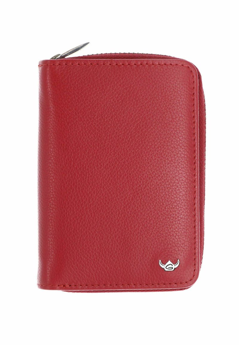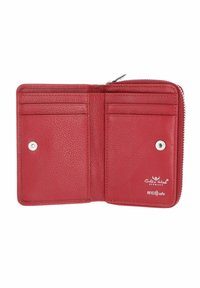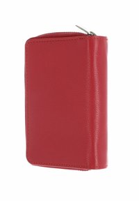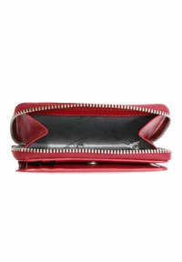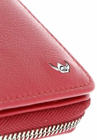 Portefeuille rouge en cuir avec fermeture éclair autour, surface texturée et petit logo argenté dans le coin inférieur droit.