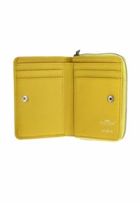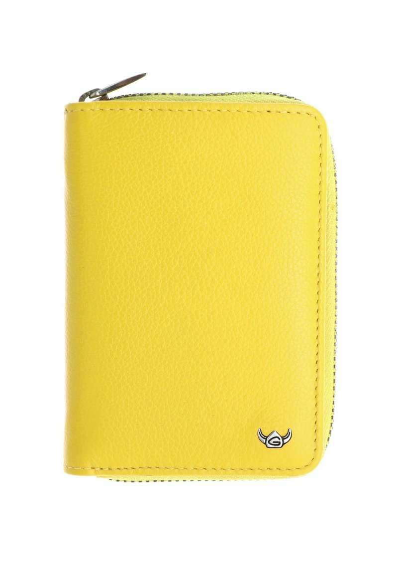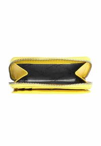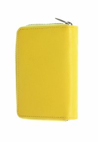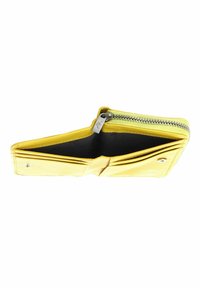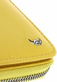 Portefeuille en cuir jaune avec fermeture éclair, surface texturée et petit logo argenté à cornes en bas à droite.