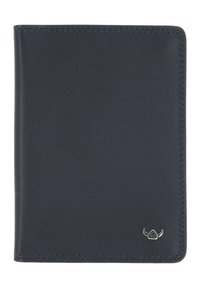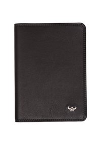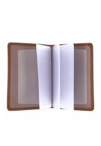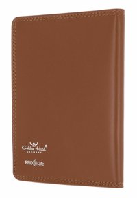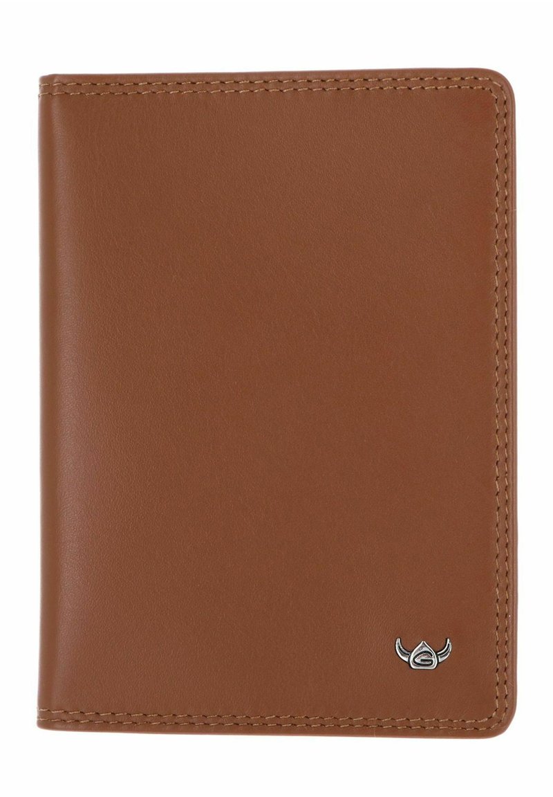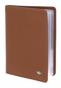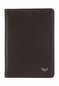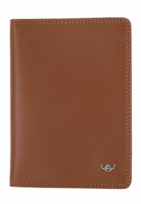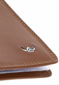 Portefeuille en cuir marron avec des coutures visibles et un petit logo argenté représentant un emblème stylisé avec des cornes dans le coin inférieur droit.