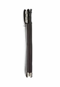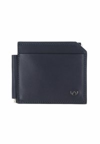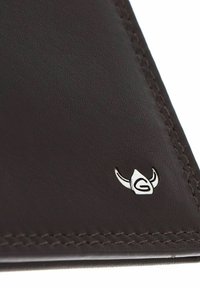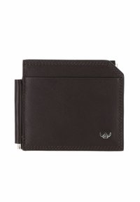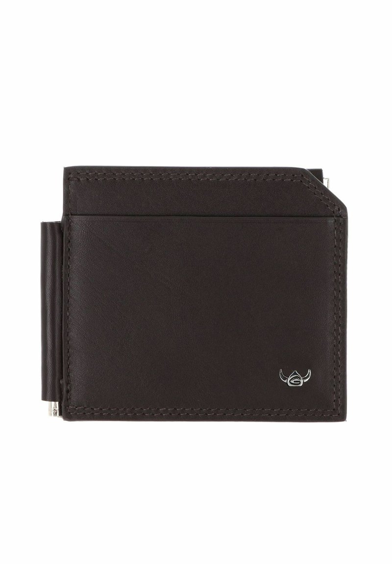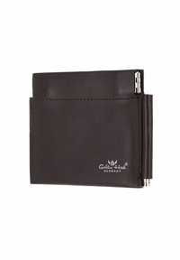 Portefeuille bifold en cuir marron foncé avec une pince métallique pour billets sur le côté gauche et un petit logo argenté en bas à droite.