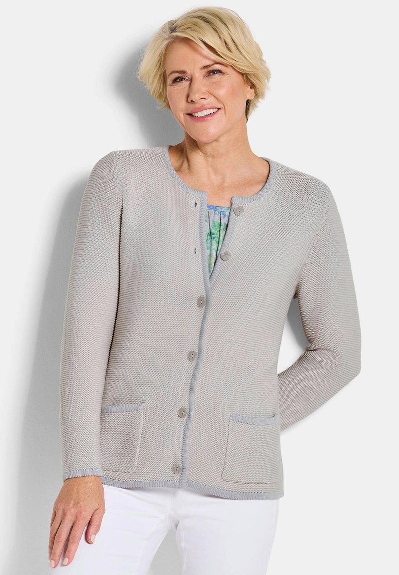 Femme souriante aux cheveux blonds courts portant un cardigan gris clair boutonné avec des poches avant sur un chemisier à motifs et un pantalon blanc.