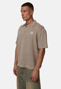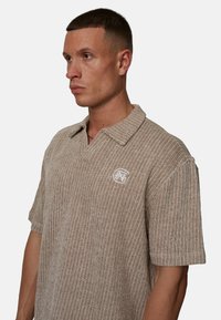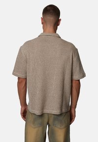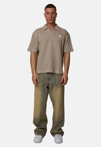 Homme portant une chemise beige côtelée à manches courtes avec col et un jean bleu délavé, debout devant un fond blanc uni.