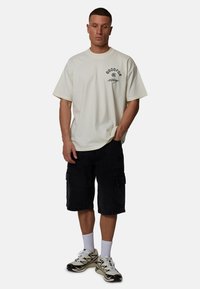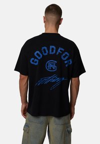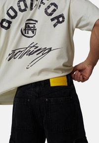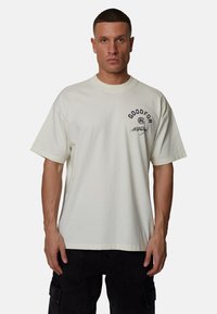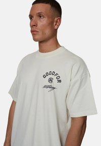 T-shirt en coton blanc avec texte noir "GOOD FOR" au-dessus d'un logo et "nothing" en écriture cursive, coupe décontractée, manches courtes et texture douce.