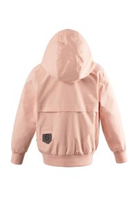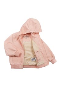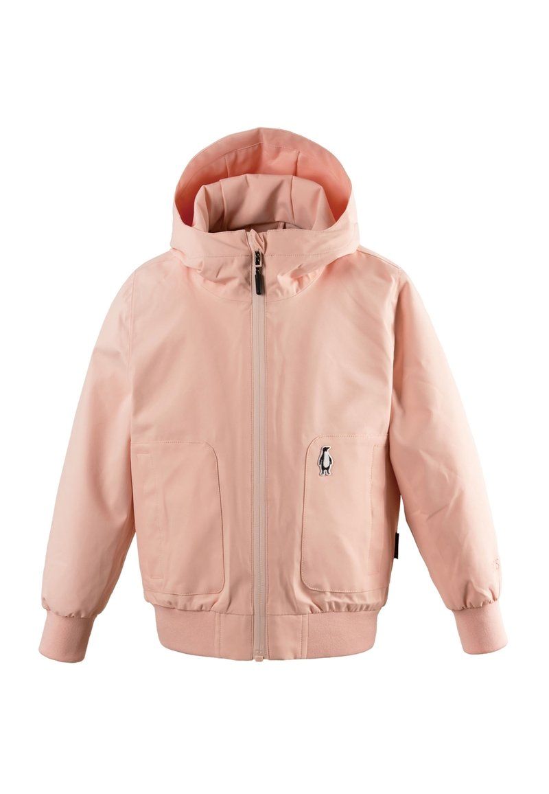 Veste à capuche rose clair avec fermeture éclair frontale, deux poches, poignets côtelés et un petit logo pingouin noir et blanc sur la poche gauche.