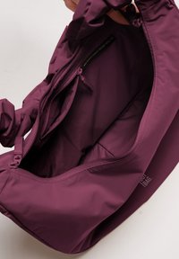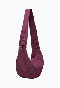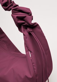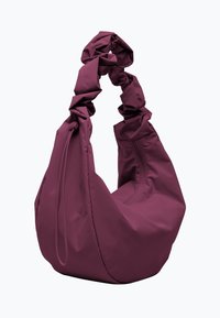 Sac violet à bandoulière avec une sangle froncée, fabriqué en matériau doux, de forme ronde et avec une marque discrète à l'avant.