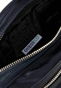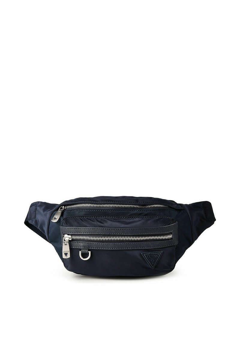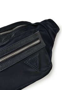 Sac banane noir en nylon avec deux fermetures éclair en argent, un anneau en D en métal et un patch logo triangulaire Guess sur la poche avant.