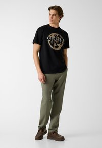 Jeune homme aux cheveux bruns portant un t-shirt noir Guess avec un logo beige et un pantalon vert olive, debout avec une main dans la poche.