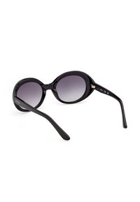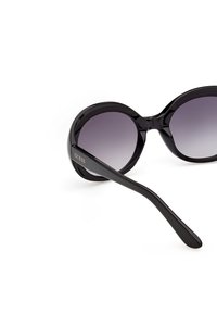 Lunettes de soleil Guess ovales noires avec verres dégradés foncés et montures épaisses et brillantes posées sur un fond blanc.