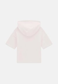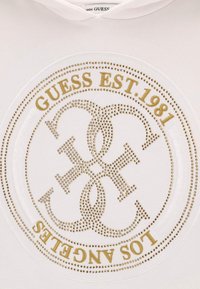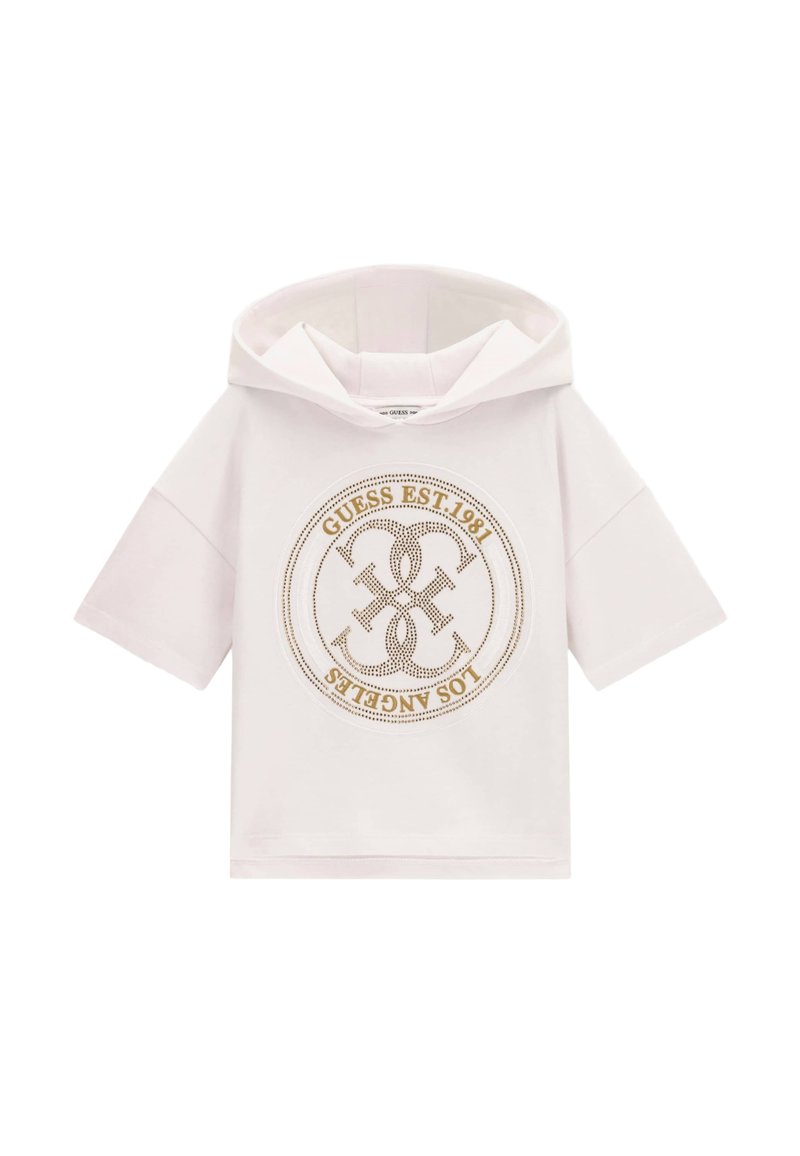 Sweat à capuche blanc à manches courtes avec logo circulaire doré Guess et texte "GUESS EST. 1981 LOS ANGELES" sur le devant.