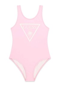 Maillot de bain une pièce noir avec un logo triangulaire blanc bordé de rouge comportant le texte "GUESS BEACH" et un palmier rouge au centre.