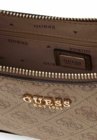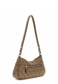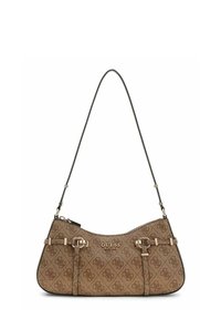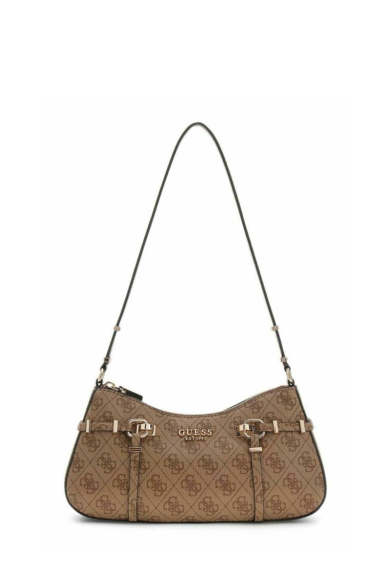 Sac à main marron de la marque Guess avec motif monogramme, boucles dorées, bandoulière ajustable et fermeture éclair.