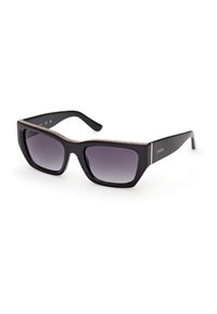 Lunettes de soleil rectangulaires mauves avec verres dégradés foncés, ornées de petits strass le long du bord supérieur et avec le logo "GUESS" sur la branche.