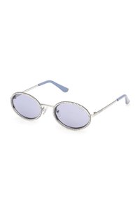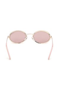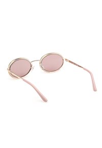 Lunettes de soleil ovales avec verres teintés rose, montures en or rose, branches avec embouts roses et détails en strass autour des verres.