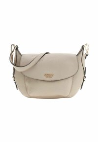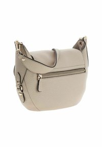 Sac bandoulière en cuir beige au design incurvé, avec une sangle ajustable, des accessoires dorés et un logo embossé à l'avant.