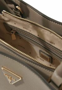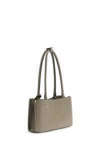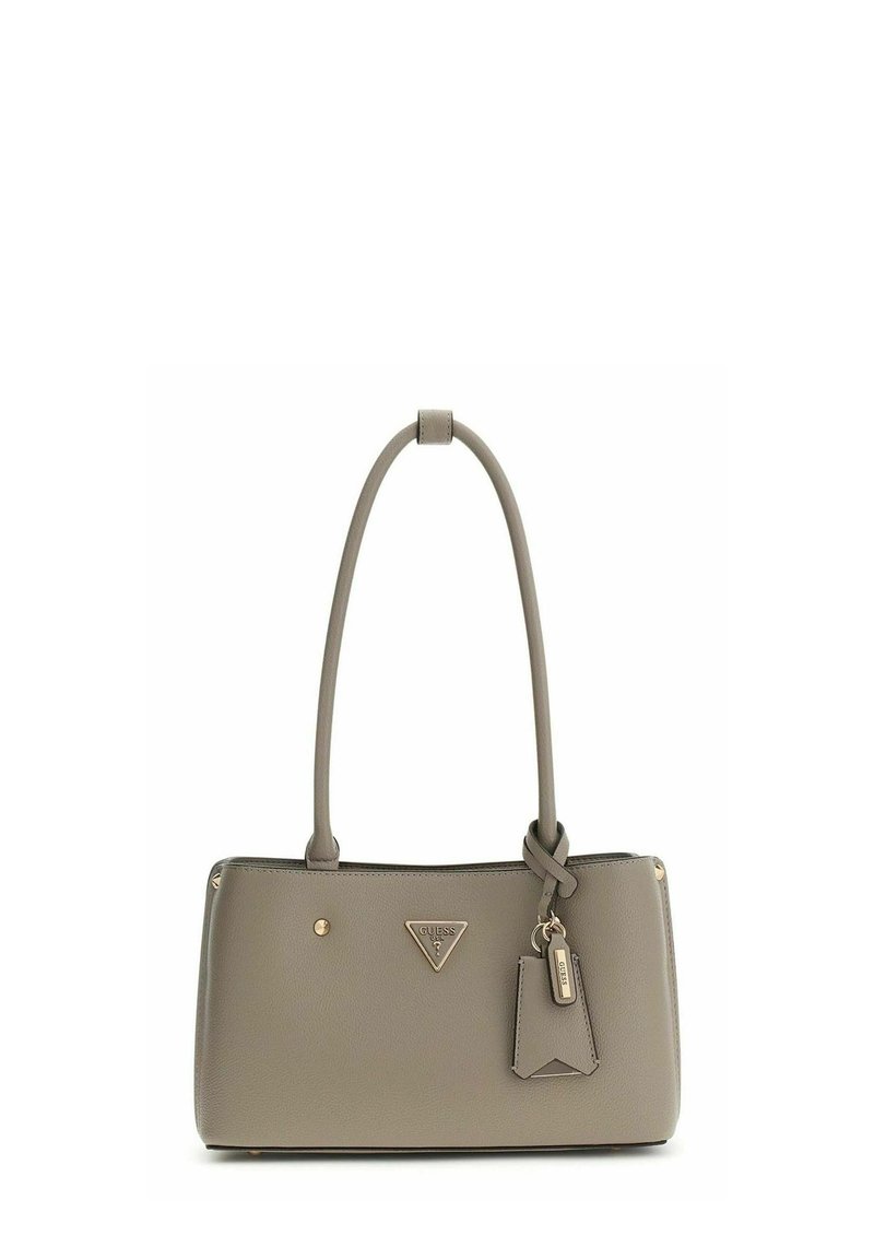 Sac à main synthétique gris au design structuré, texture lisse, courtes brides d'épaule, quincaillerie dorée et accent logo.