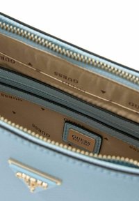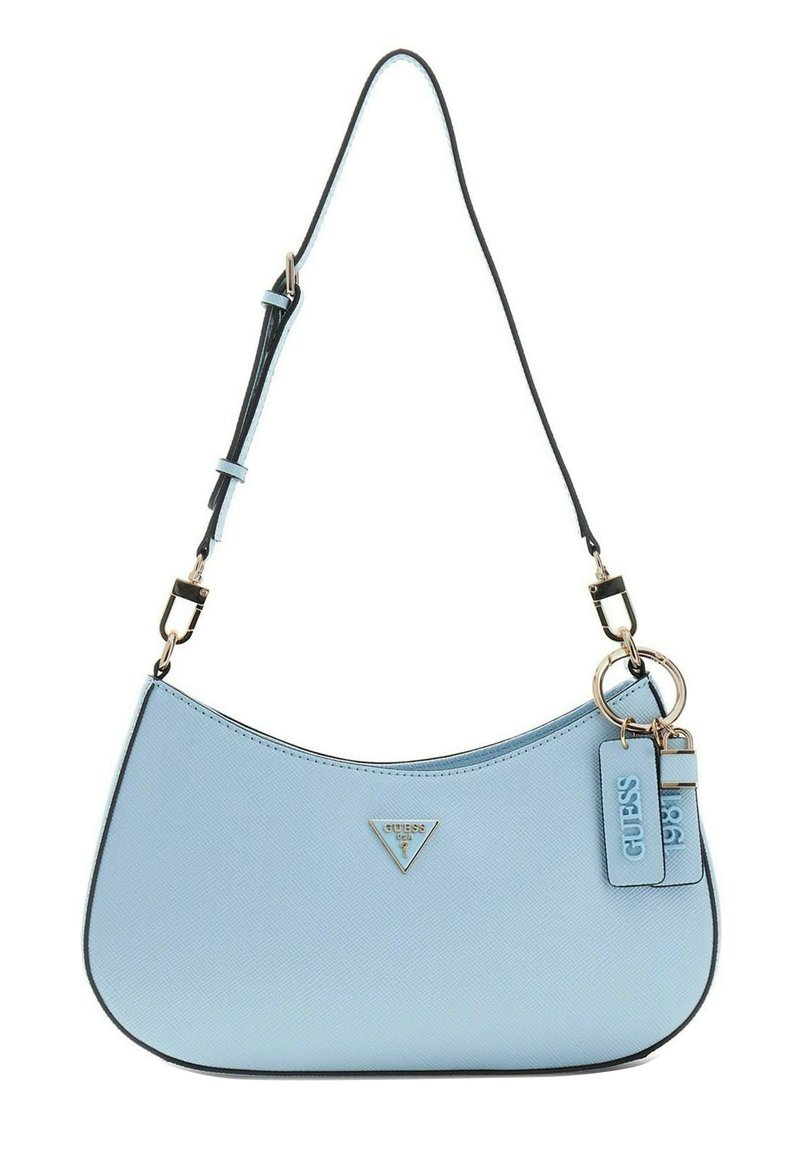 Sac bandoulière Guess bleu clair avec sangle réglable, logo métallique triangulaire et deux étiquettes de marque suspendues sur le côté droit.