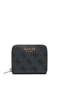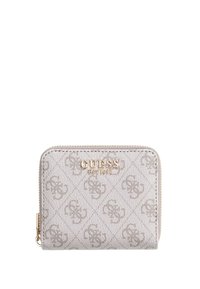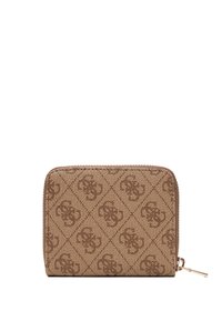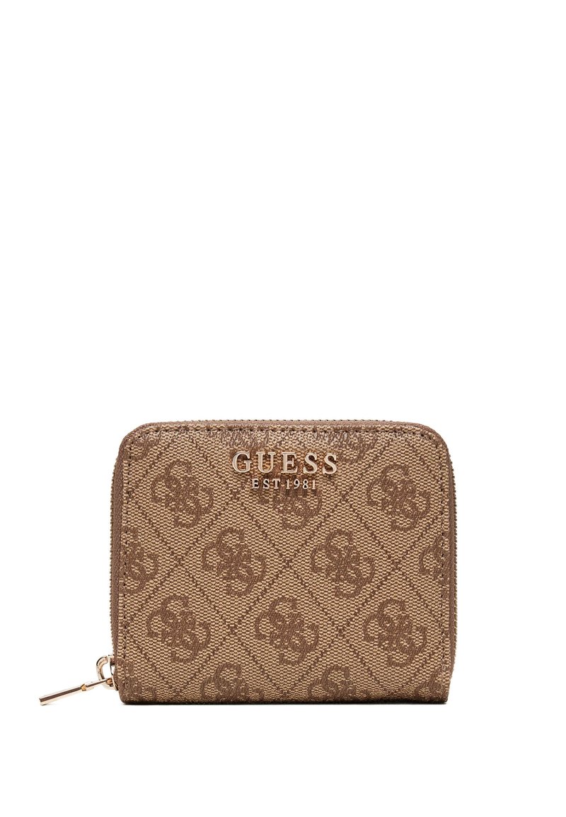 Portefeuille marron Guess avec motif logo intégral, fermeture éclair dorée et inscription "GUESS EST 1981" dorée sur le devant.