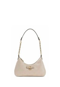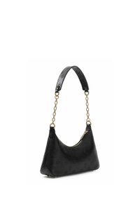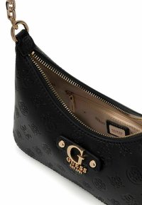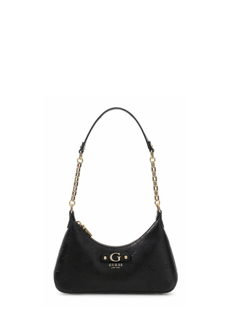 Sac à main noir Guess avec motif de logo embossé, chaîne dorée et bandoulière en cuir, ainsi qu'une plaque de logo dorée sur le devant.
