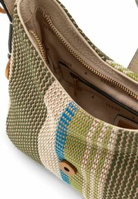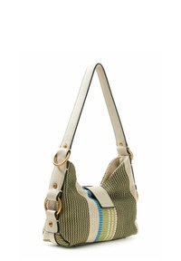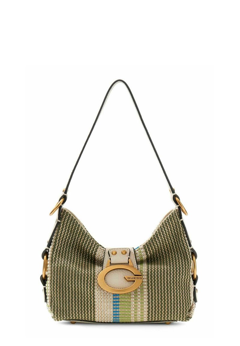 Petit sac à bandoulière tissé vert et beige avec des rayures verticales, boucle ovale dorée et sangle noire réglable.